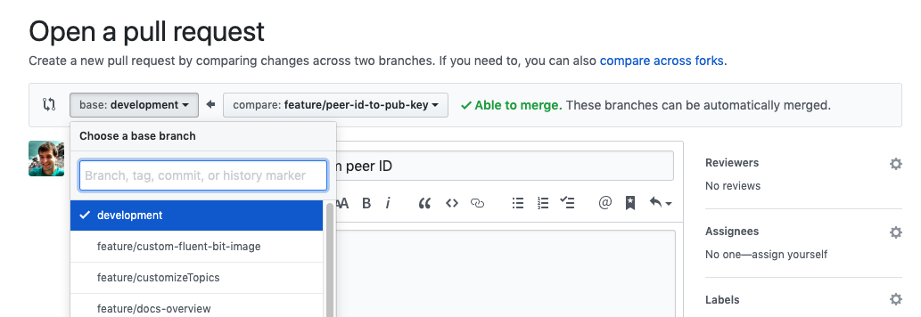 git pullAll PRs should use development as the base branch. When opening a new PR, use the dropdown menu in the GitHub UI to select development.